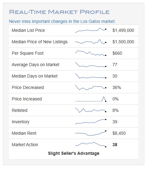This week the median list price for Los Gatos, CA 95033 is $1,499,000 with the market action index hovering around 38. This is less than last month’s market action index of 42. Inventory has increased to 39.